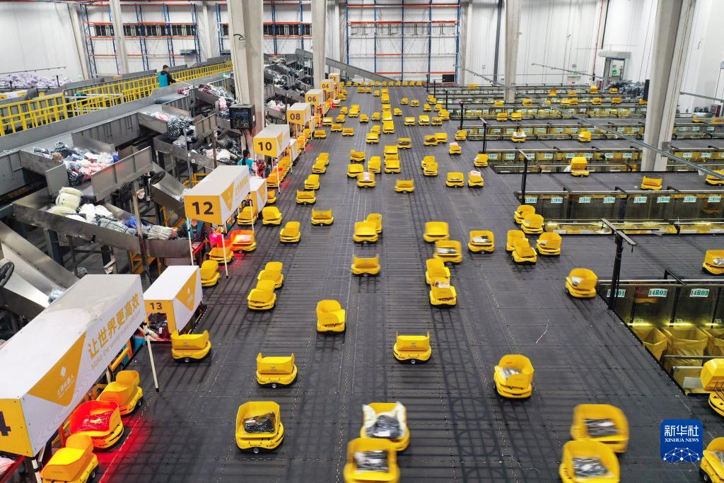 11月8日,浙江省湖州市德清縣乾元鎮第一產(chǎn)業(yè)智慧物流園區,分揀“小黃人”機器人在精準配送各類(lèi)服飾(無(wú)人機照片)。