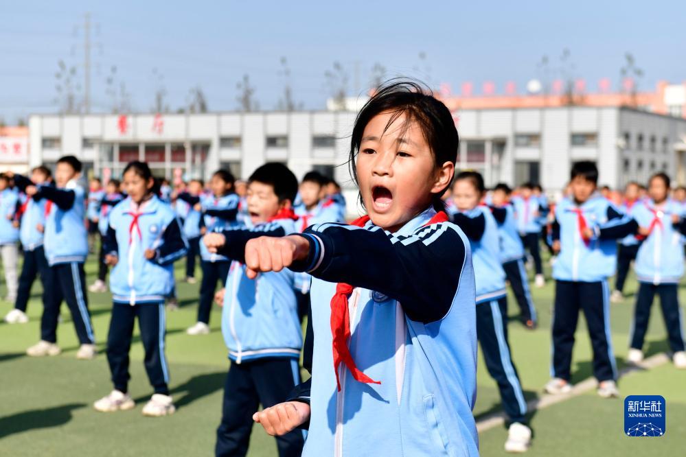 11月10日,在日照市莒縣洛河鎮中心小學(xué),同學(xué)們在陽(yáng)光大課間參加武術(shù)健身操活動(dòng)。