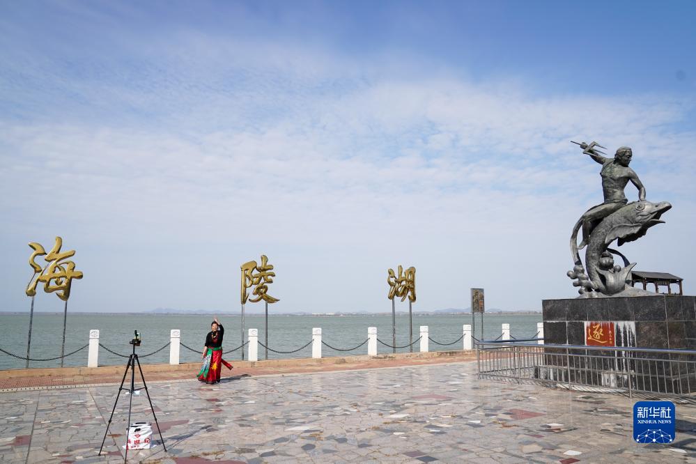 11月10日,一名游客在連云港石梁河水庫海陵湖景點(diǎn)拍照留念。