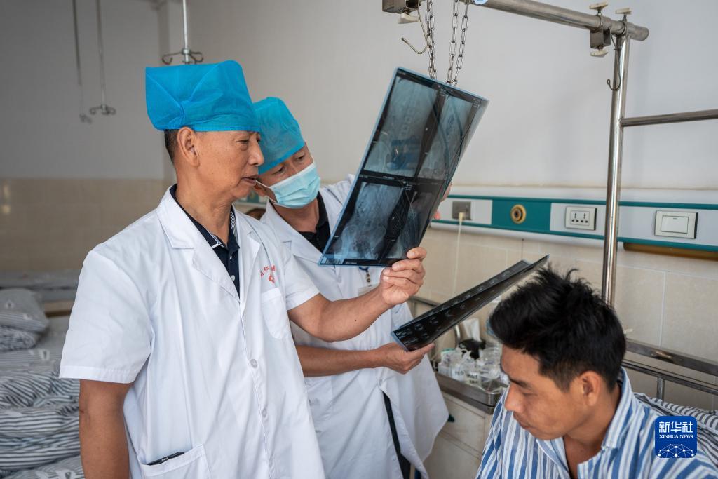在畹町仁慈醫院,沈坤(左)在查房時(shí)查看病人病情(10月29日攝)。