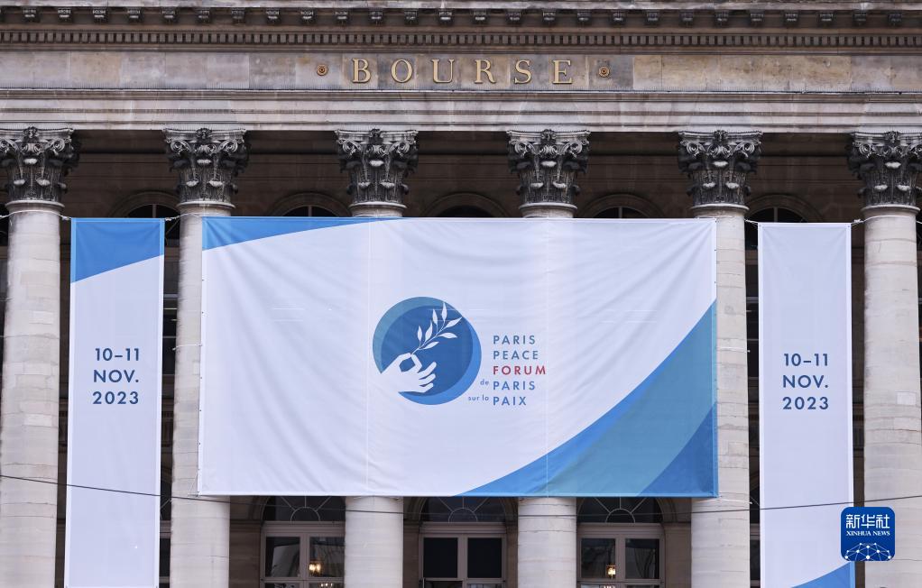 這是11月10日拍攝的巴黎和平論壇會(huì )場(chǎng)所在建筑物上的海報。