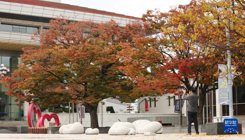 11月10日,一名男子在韓國釜山文化會(huì )館附近拍攝秋景。