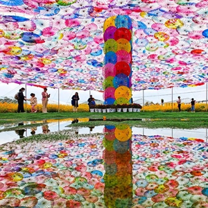 11月11日,游客在寧波市寧??h力洋鎮海頭村的傘棚下游玩賞花。