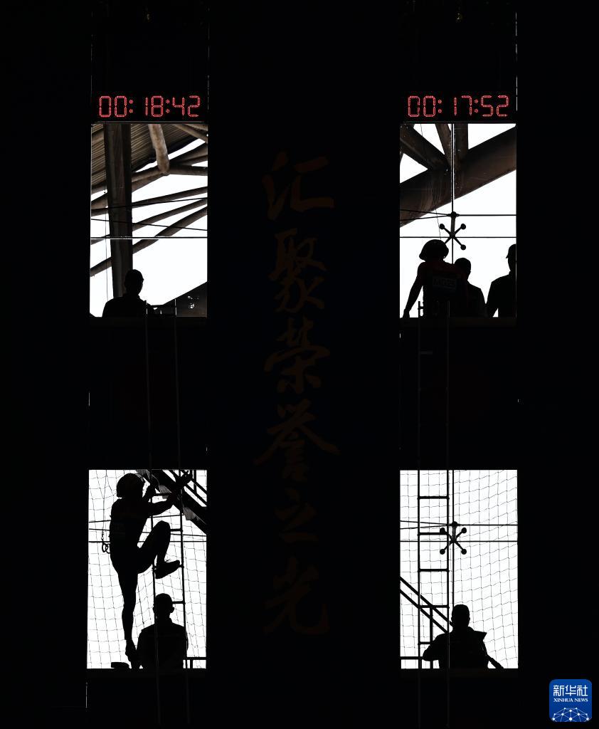 11月8日,消防員在攀登掛鉤梯比賽中。當日,第二屆全國消防行業(yè)職業(yè)技能大賽在江蘇南京開(kāi)幕。