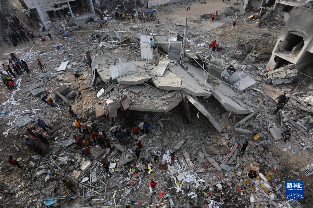 11月11日,在加沙地帶南部城市拉法,人們查看遭以色列襲擊后的建筑。
