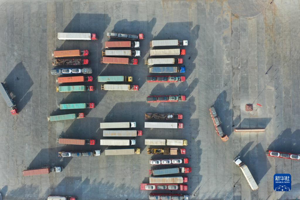 這是新疆吐?tīng)栨靥乜诎都磳⒊鼍车呢涇?chē)(11月8日攝,無(wú)人機照片)。