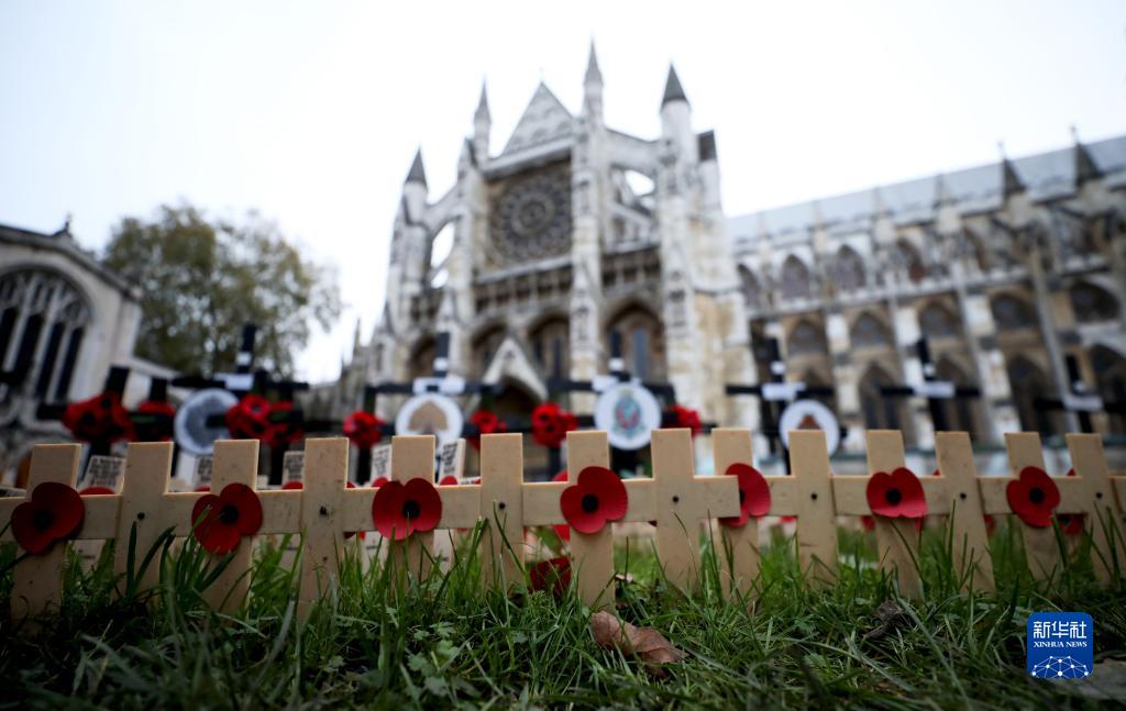 這是11月12日在英國倫敦威斯敏斯特教堂外拍攝的悼念標識。