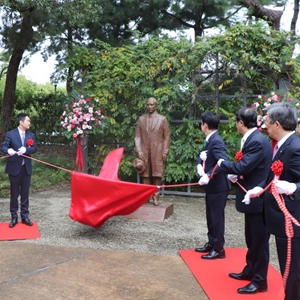 由中國美術(shù)館館長(cháng)吳為山創(chuàng )作的雕塑作品《孫文先生像》12日在日本福岡縣北九州市安川敬一郎舊宅落成揭幕。