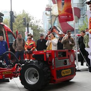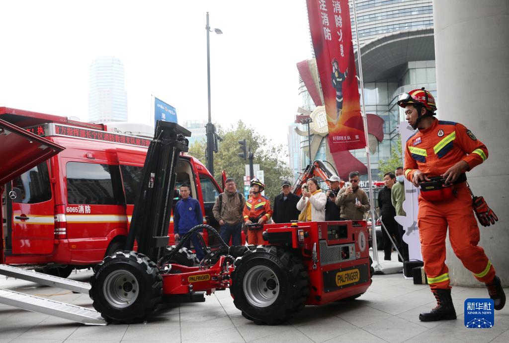 11月13日,消防員(右)在活動(dòng)現場(chǎng)進(jìn)行折疊式遙控救援叉車(chē)的機動(dòng)演示。