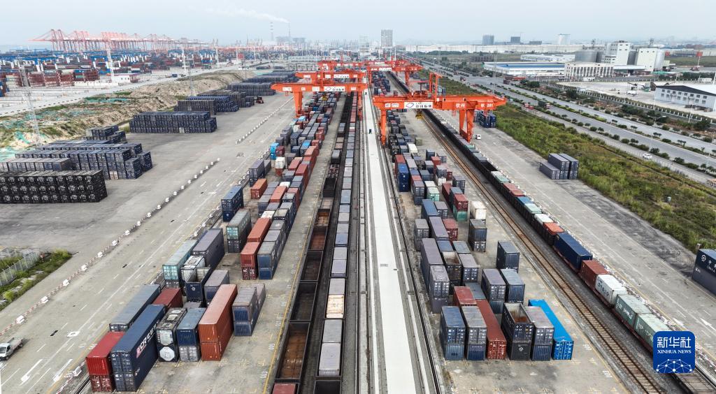 火車(chē)在欽州港碼頭裝運集裝箱(11月12日攝,無(wú)人機照片)。