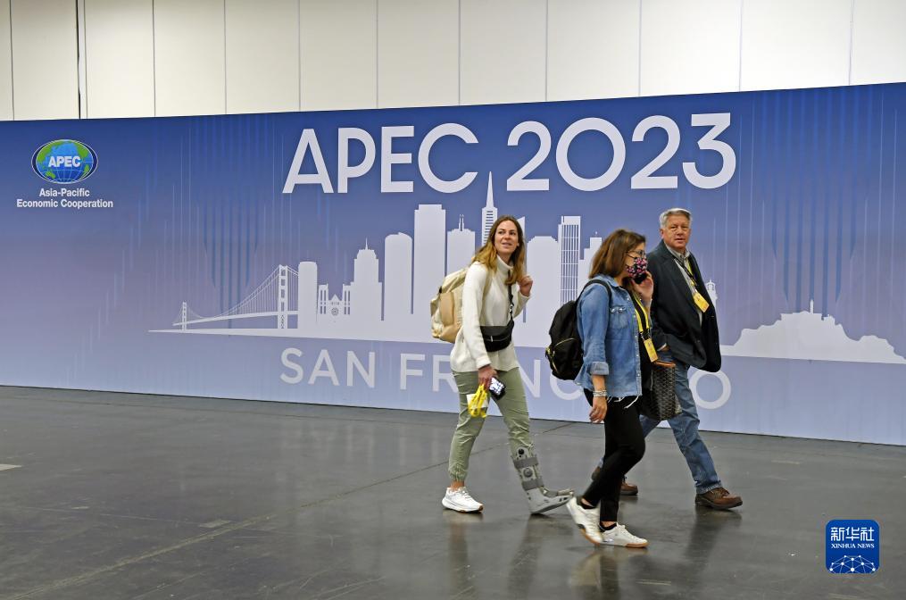 11月12日,在美國舊金山,記者經(jīng)過(guò)2023年亞太經(jīng)合組織會(huì )議國際媒體中心內的一幅海報。