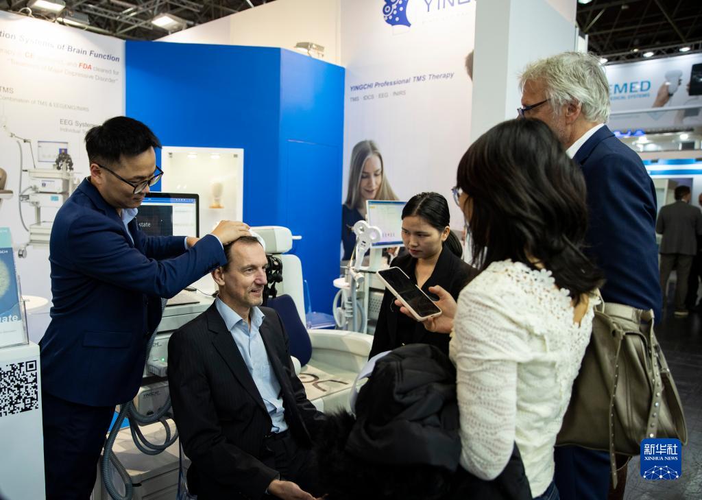 11月13日,在德國杜塞爾多夫國際醫療器械設備展,參觀(guān)者在英智醫療展位體驗經(jīng)顱磁刺激儀。新華社記者 張帆 攝