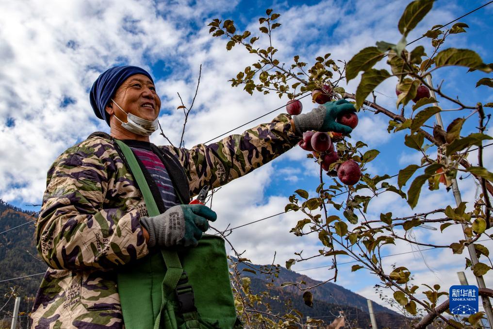 米林市羌納鄉西藏林芝現代蘋(píng)果標準化園區內,農民在采摘蘋(píng)果(11月13日攝)。