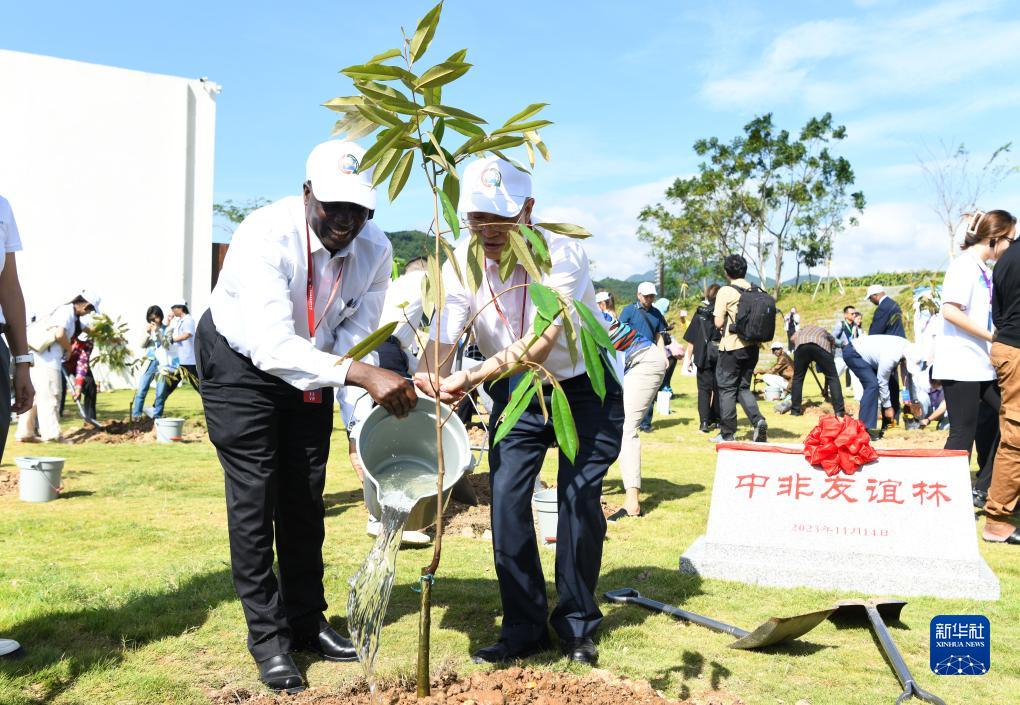 11月14日,參加中非農業(yè)合作論壇的嘉賓在海南省三亞市吉陽(yáng)區大茅村共植中非友誼林。
