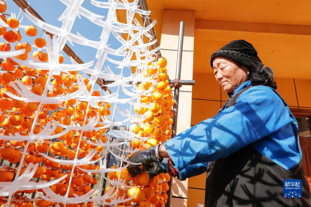 11月14日,在甘肅省甘南藏族自治州舟曲縣立節鎮杰迪村,村民在晾曬柿子。