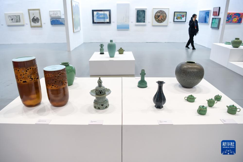 11月14日,參會(huì )嘉賓在2023兩岸企業(yè)家峰會(huì )10周年年會(huì )海峽兩岸青年當代藝術(shù)與文化創(chuàng )意展參觀(guān)。