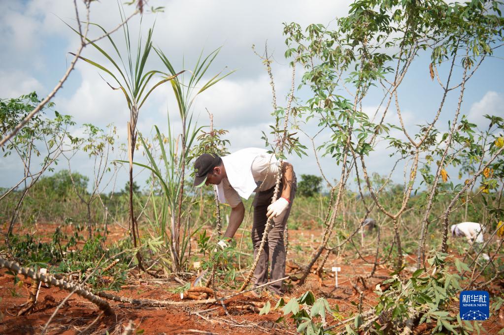 在位于海南省的中國熱帶農業(yè)科學(xué)院的一處基地,來(lái)自埃及的副教授哈馬達·穆罕默德·哈?!ぐ⒉范爬瓍⒓又袊鵁峥圃簾釒锛夹g(shù)研究所木薯育種團隊開(kāi)展的木薯選育新技術(shù)培訓(2020年3月24日攝)。