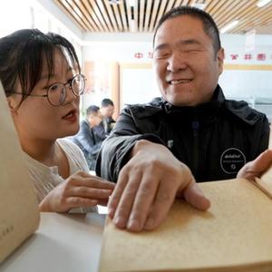 指尖滑過(guò)盲文、耳機傾聽(tīng)讀物,內蒙古巴彥淖爾市烏拉特前旗圖書(shū)館視障閱覽室內視障人士可以無(wú)礙“閱讀”書(shū)籍。
