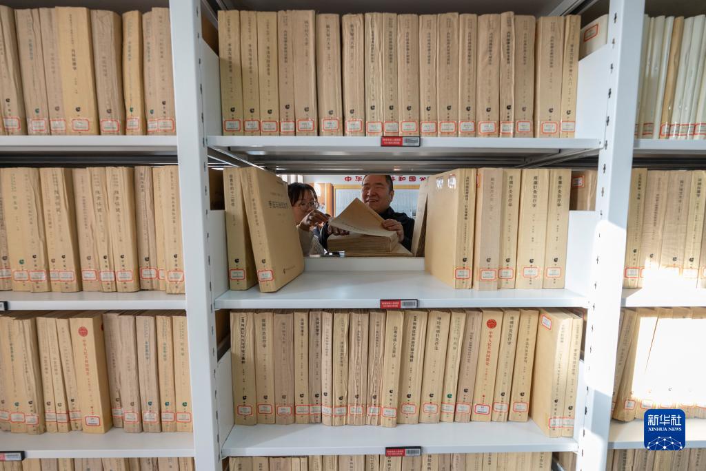 11月14日,在內蒙古烏拉特前旗圖書(shū)館視障閱覽室內,一名工作人員(左)幫助視障人士挑選盲文書(shū)籍。