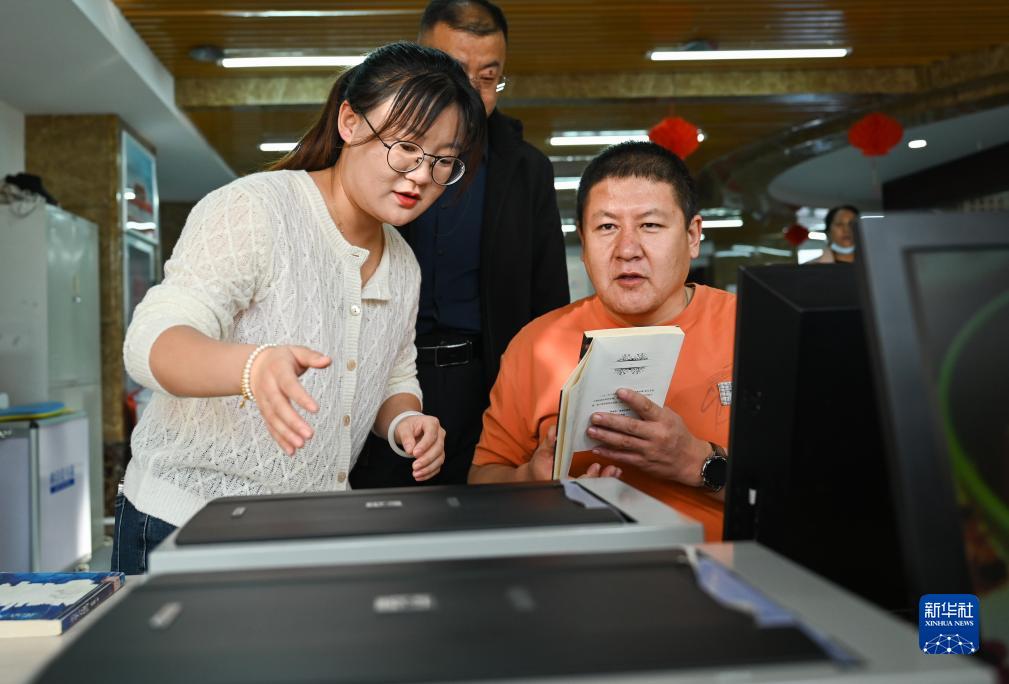 11月14日,在內蒙古烏拉特前旗圖書(shū)館視障閱覽室內,工作人員(左)幫助視障人士操作智能聽(tīng)書(shū)設備。