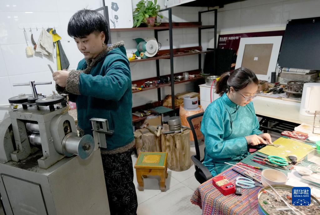 11月14日,在內蒙古烏拉特前旗禾蘇格爾銀匠店內,齊天賜(左)與愛(ài)人蘇曉霞一同加工銀器。