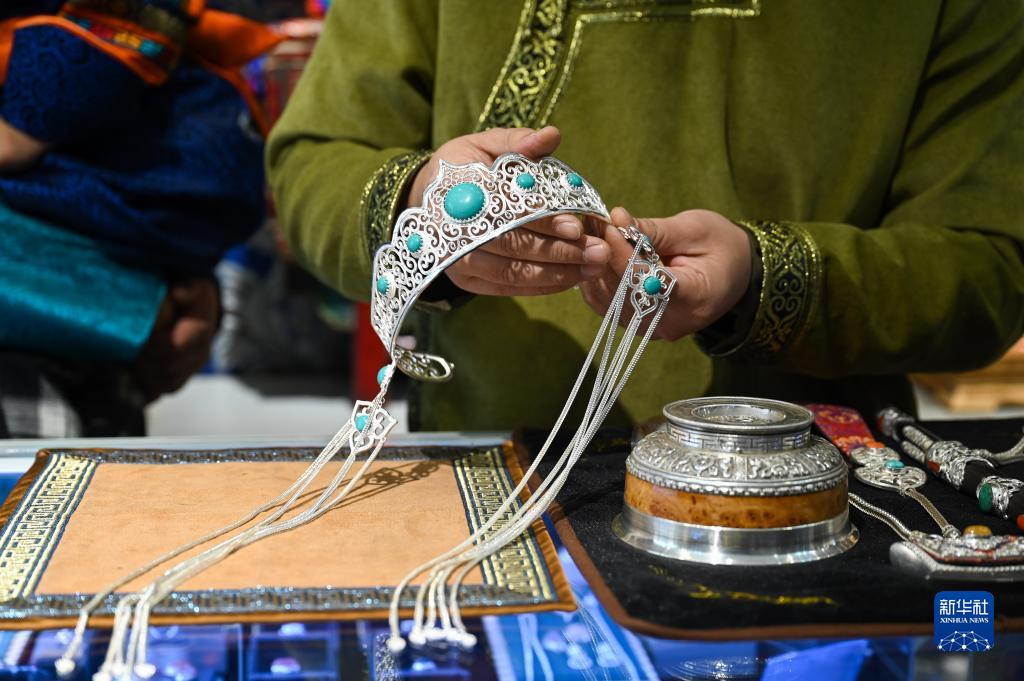 11月14日,在內蒙古烏拉特前旗禾蘇格爾銀匠店內,齊天賜展示自己制作的手工銀飾。