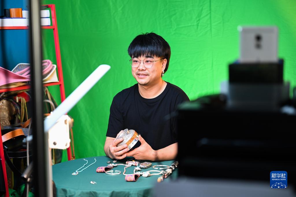 11月14日,在內蒙古烏拉特前旗的直播工作室內,齊天賜在網(wǎng)絡(luò )直播賣(mài)銀飾。