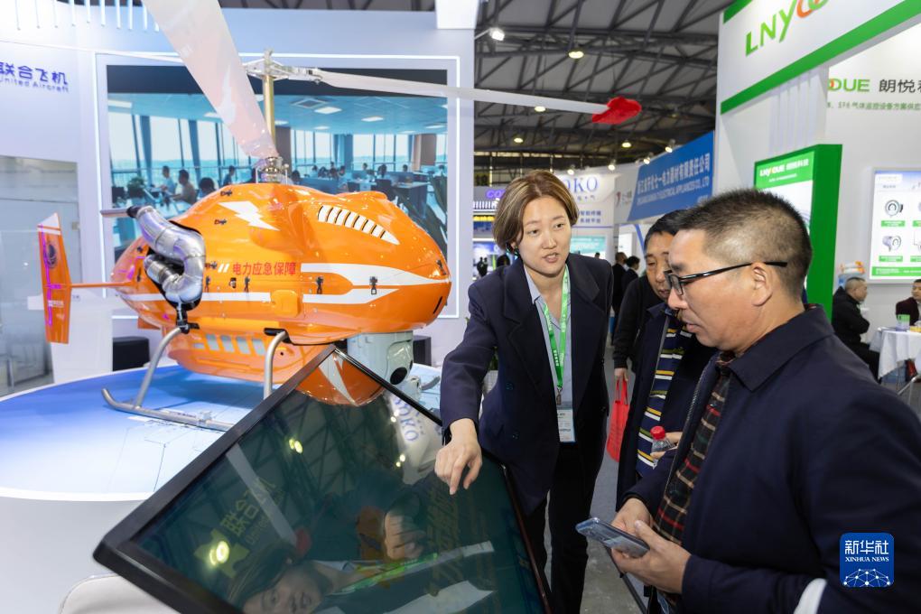 11月15日,在上海國際電力設備及技術(shù)展覽會(huì )的聯(lián)合飛機展位,工作人員向參展人員介紹通用型無(wú)人直升機。