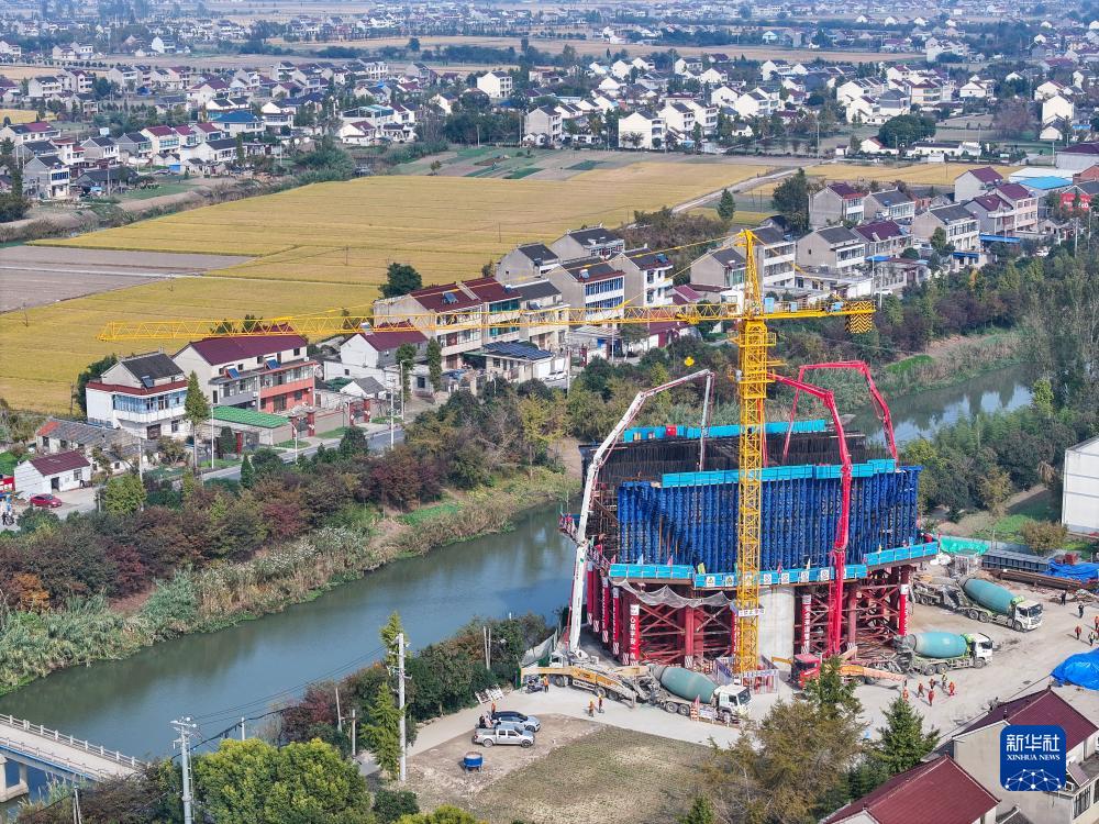 這是11月15日拍攝的滬渝蓉高鐵泰州段通泰揚特大橋跨如泰運河及X355縣道連續梁拱施工現場(chǎng)(無(wú)人機照片)。