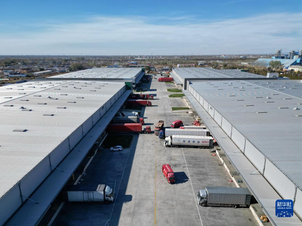 11月16日,在普洛斯唐山豐潤物流園,京東物流的貨車(chē)在運輸商品(無(wú)人機照片)。