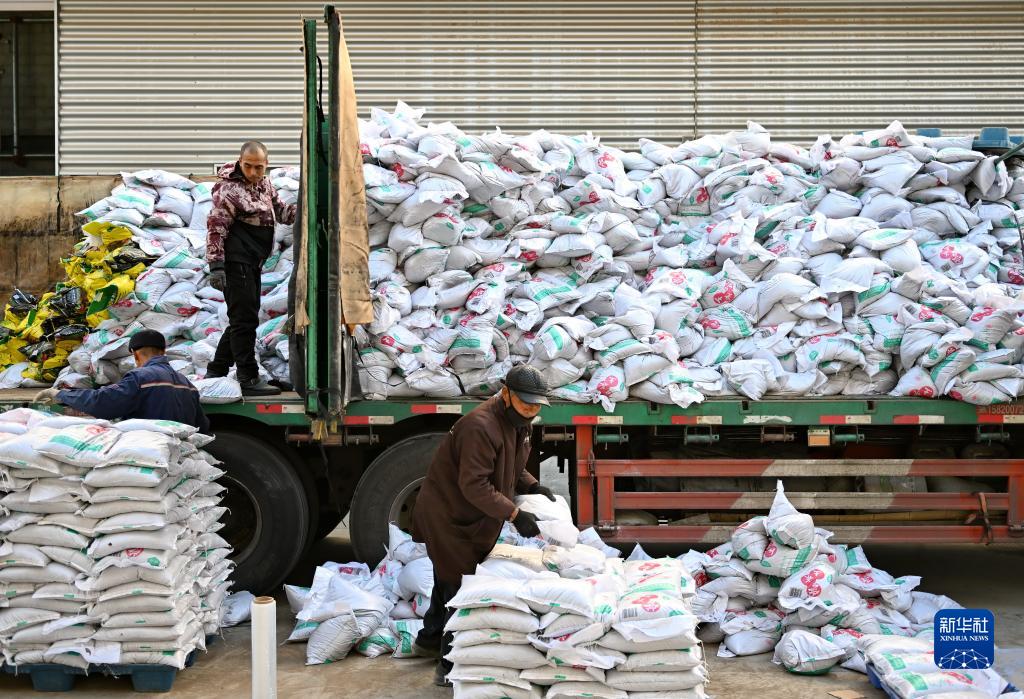 11月16日,在位于唐山市豐潤區的唐山公路港物流有限公司,工人在整理農資產(chǎn)品。