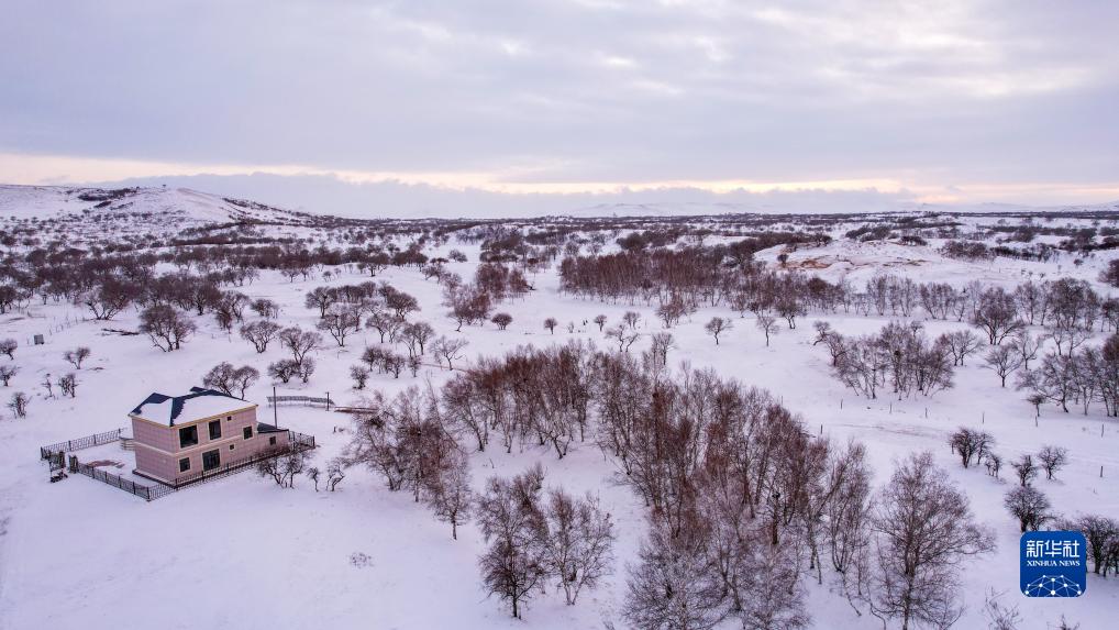 這是11月16日拍攝的被白雪覆蓋的烏珠穆沁草原上的樹(shù)林(無(wú)人機照片)。