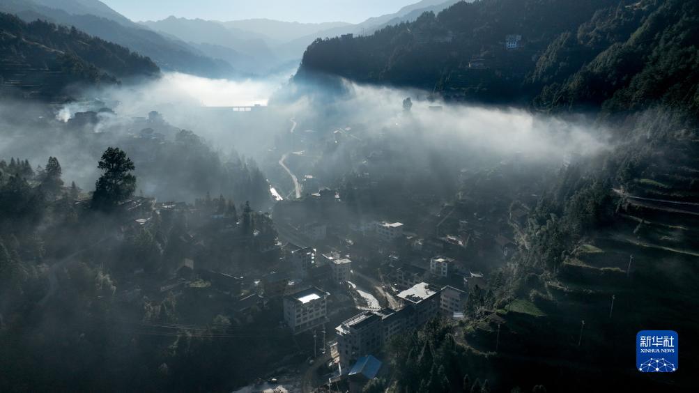 初冬時(shí)節,位于貴州省黔東南苗族侗族自治州雷山縣境內的雷公山國家森林公園,云霧繚繞,民居、梯田、公路、橋梁交相輝映,美不勝收,景色如畫(huà)。