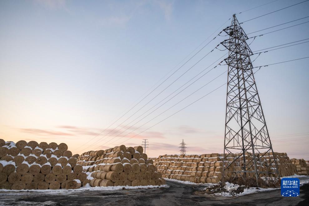 這是11月14日拍攝的堆放在鶴崗市生物科技產(chǎn)業(yè)園內用于生物質(zhì)發(fā)電的秸稈。