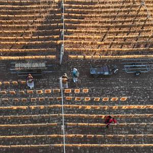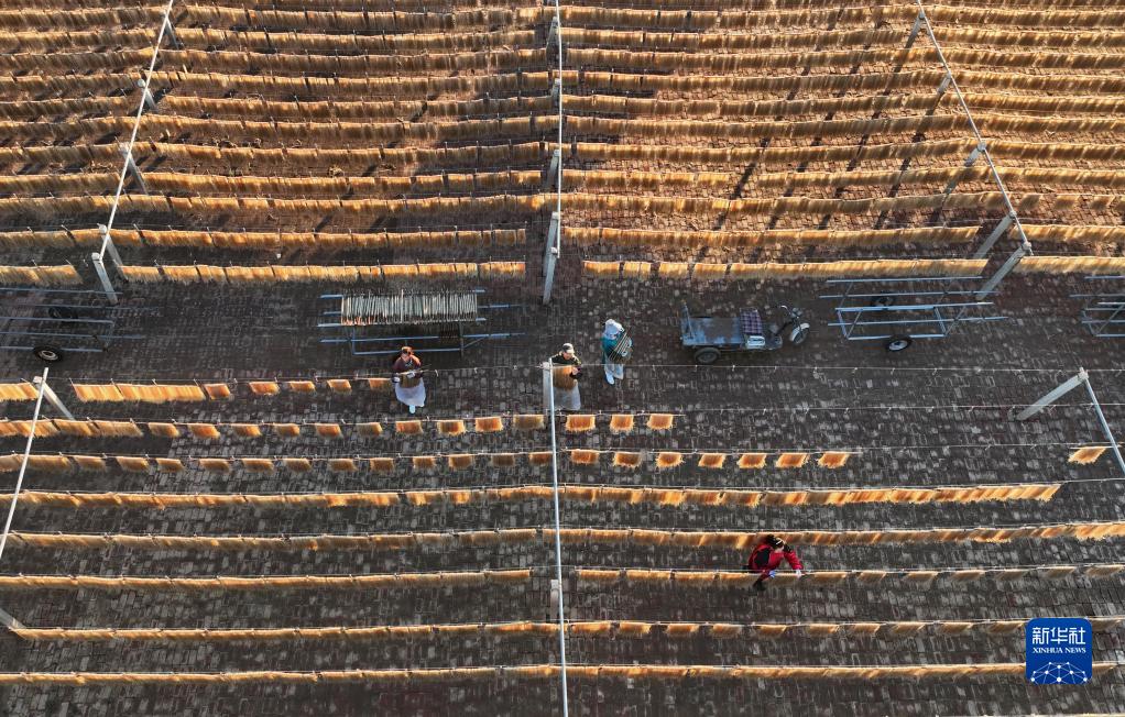 11月17日,河北省遵化市平安城鎮一家傳統手工粉條加工合作社的社員在晾曬粉條(無(wú)人機照片)。
