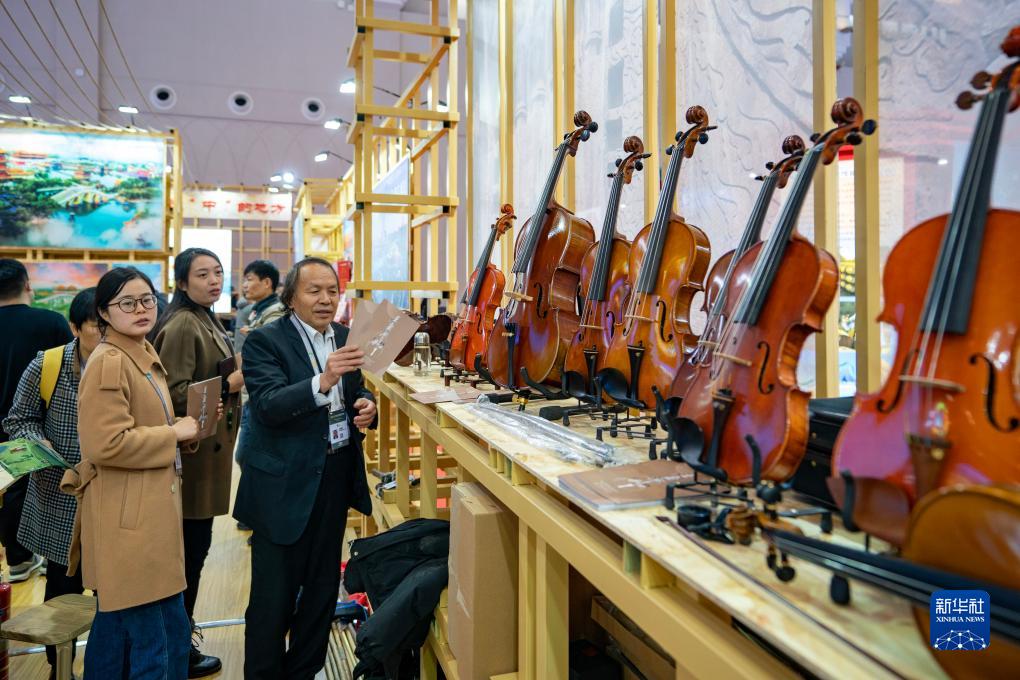 11月17日,人們在2023中國國際旅游交易會(huì )上觀(guān)看展出的小提琴。