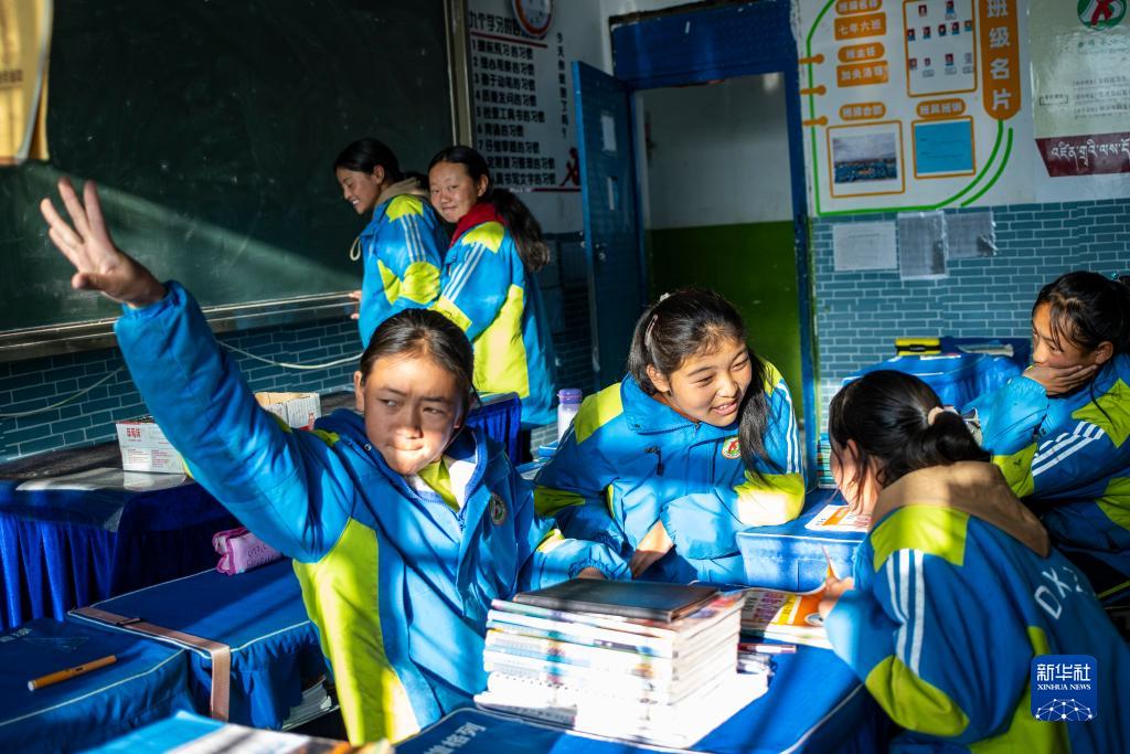 斯曲卓瑪(右三)和同學(xué)在課間休息(11月10日攝)。
