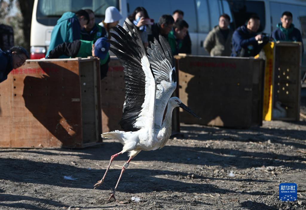 11月18日,一只被救助的東方白鸛振翅起飛。