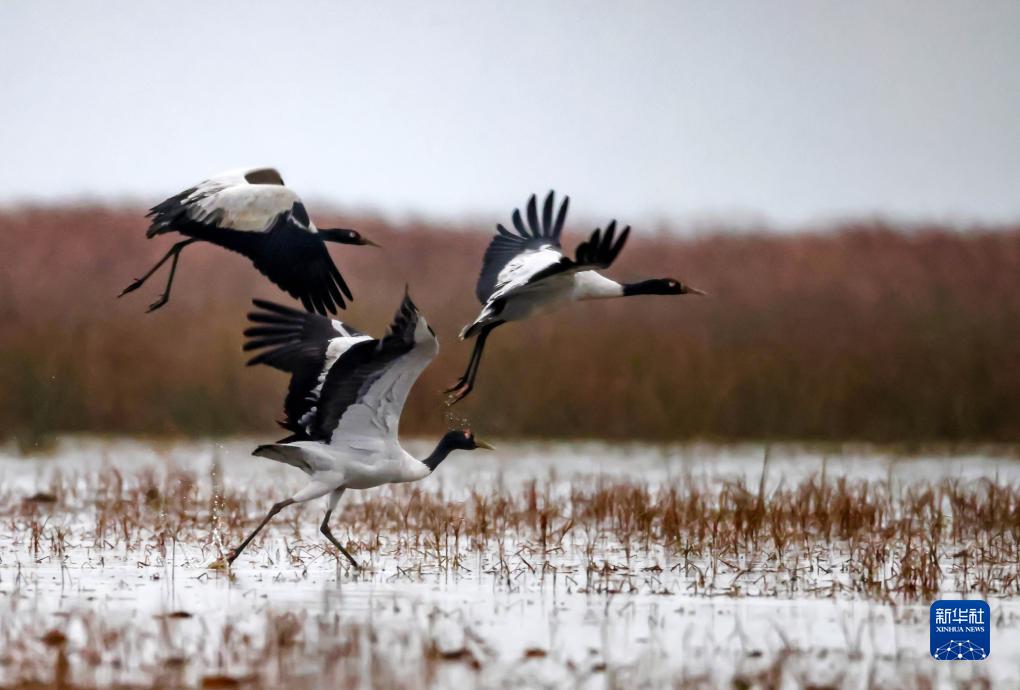 11月18日在貴州草海國家級自然保護區拍攝的黑頸鶴。