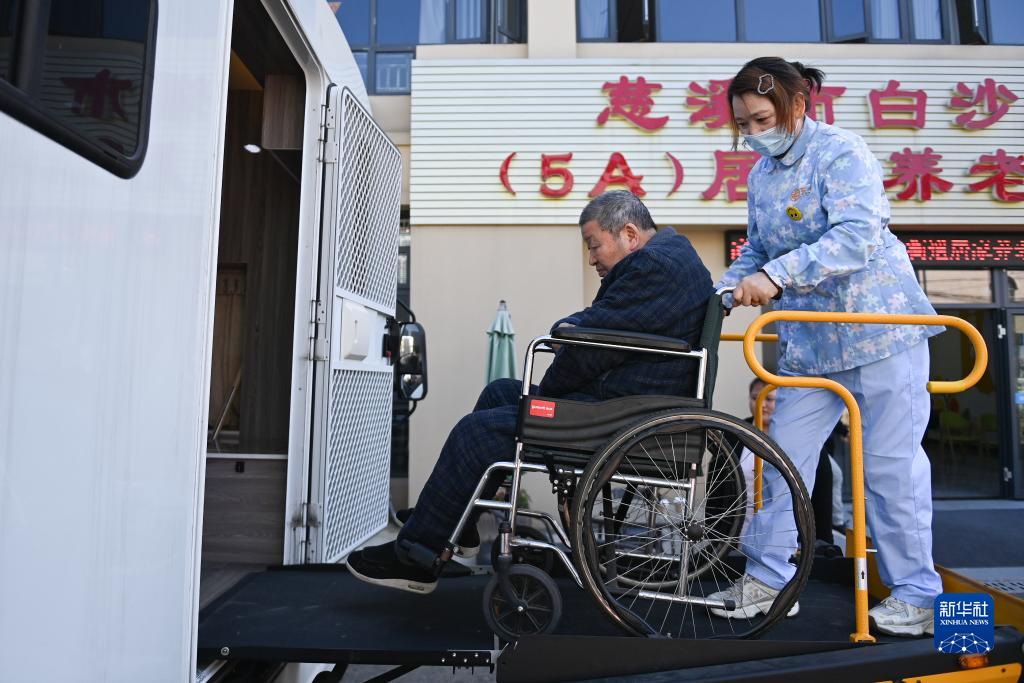11月19日,在慈溪市白沙路街道居家養老服務(wù)中心,81歲老人吳森泉(左)在助浴師的陪同下進(jìn)入移動(dòng)助浴車(chē)接受助浴服務(wù)。