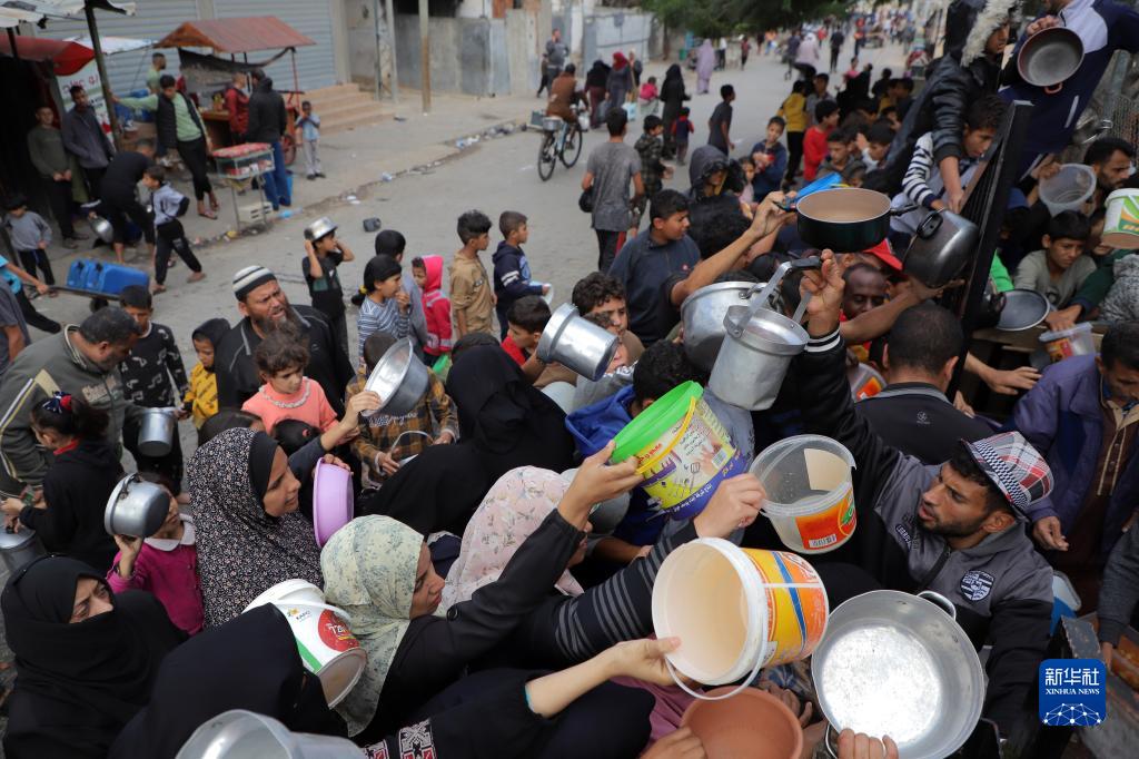 11月19日,在加沙地帶南部城市拉法,人們領(lǐng)取救濟食物。