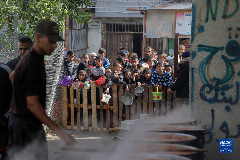 11月19日,在加沙地帶南部城市拉法,人們領(lǐng)取救濟食物。