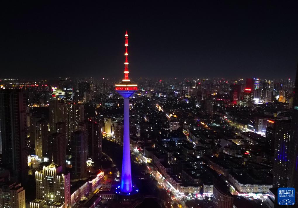 11月20日,沈陽(yáng)市遼寧廣播電視塔為世界兒童日亮燈(無(wú)人機照片)。