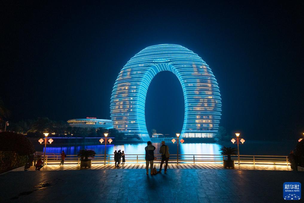 11月20日,人們在浙江省湖州市南太湖新區月亮灣欣賞為世界兒童日亮燈的當地地標建筑。