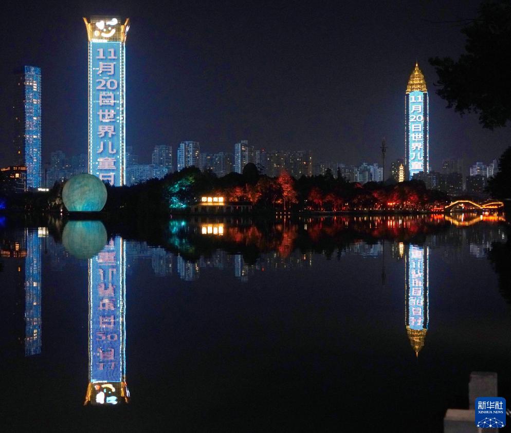 11月20日,浙江省溫州市地標性建筑世貿中心大廈和置信大廈為世界兒童日亮燈。