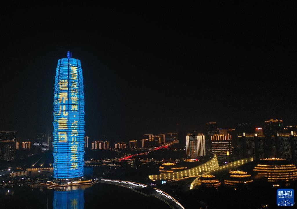 當日是世界兒童日,一些地區的地標建筑點(diǎn)亮象征兒童友好的藍色燈光。
