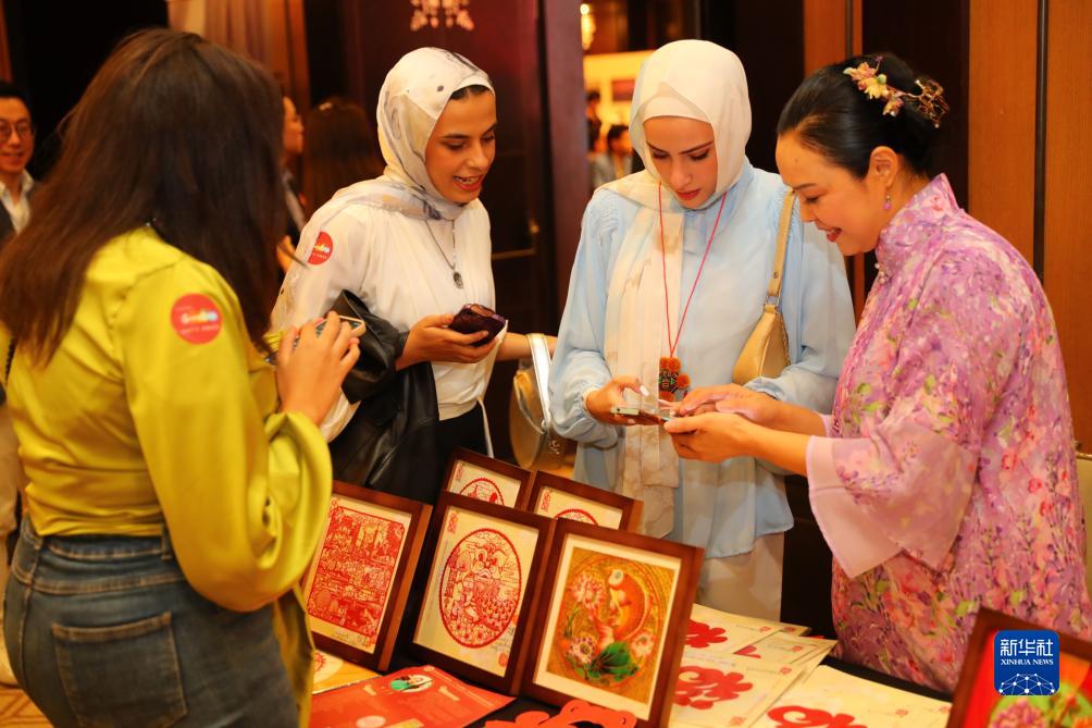11月19日,在埃及開(kāi)羅舉行的粵港澳大灣區世界級旅游目的地推介暨“魅力廣東”視覺(jué)展上,人們在非遺展區了解剪紙。