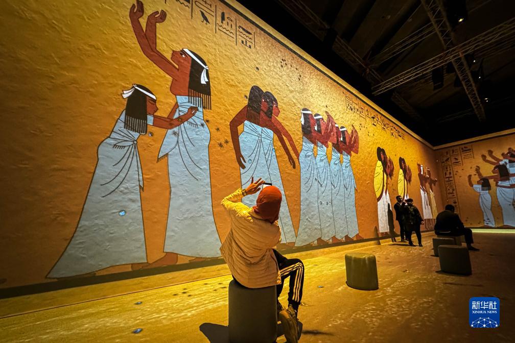 當日,圖坦卡蒙沉浸式展覽在大埃及博物館開(kāi)幕。觀(guān)眾可通過(guò)現場(chǎng)絢麗的視覺(jué)效果和配樂(lè )沉浸式了解法老圖坦卡蒙的故事,以及古埃及的歷史文化。