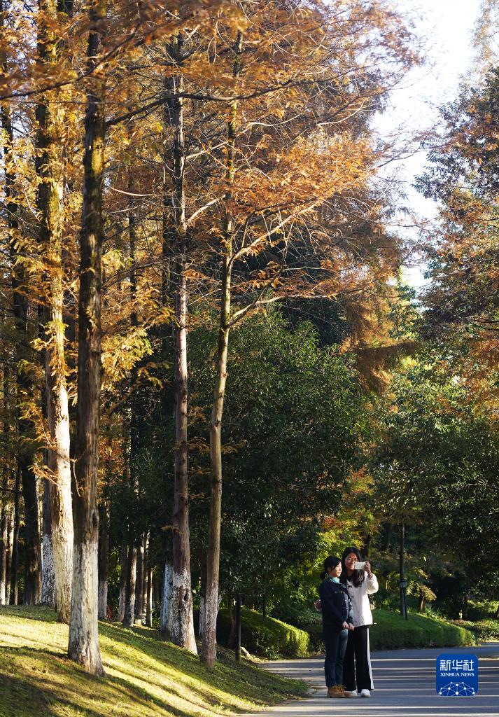 初冬時(shí)節,在位于江西省南昌市的梅嶺國家森林公園,紅色的水杉、黃色的銀杏、綠色的松柏等相互交錯,構成一幅美麗的冬日畫(huà)卷,吸引不少游客前來(lái)觀(guān)賞。