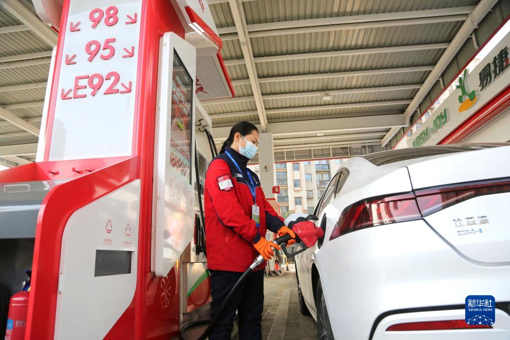 11月21日,在江蘇省連云港市連云區一加油站,工作人員給汽車(chē)加油。